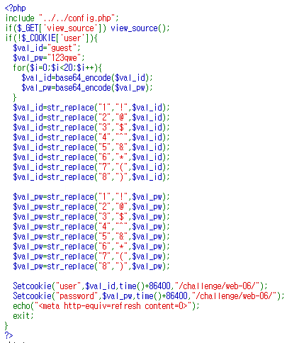 - Setcookie 함수를 이용해 user 쿠키를 생성한 후 $val_id 변수 안에있는 값을 user 값으로 하고 만료시간을 time()+86400 으로 지정하고 경로는 /challenge/web-06/ 으로 한다.