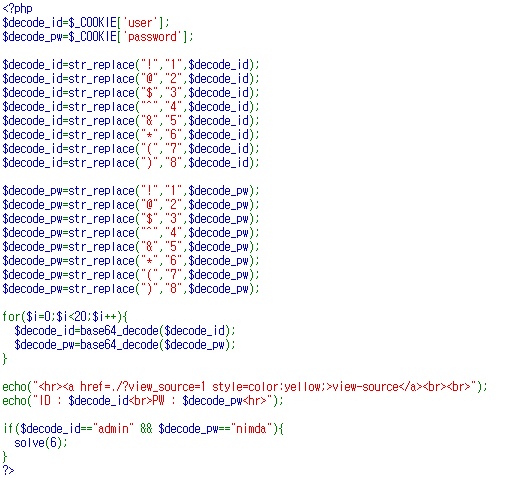- 만약에 $decode_id 와 $decode_pw 가 admin , nimda 이라면 solve(6); 함수를 불러온다.