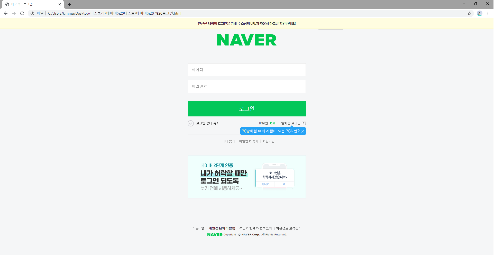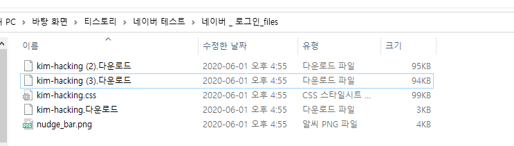 하지만 css 와 js 파일들을 html 에서 읽지 못하게 이름을 마구 바꾸었더니 갑자기 아까 들어갔던 html 파일 네이버 로그인 화면이