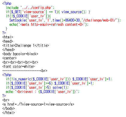 SetCookie("user_lv","1",time()+86400*30,"/challenge/web-01/"); 는 쿠키를 생성하는것이고