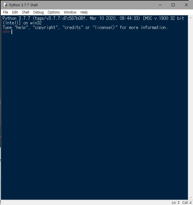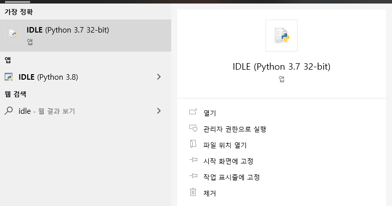 이렇게 하나가 뜨는것을 볼수있다 IDLE (Python 3.7(버전에따라 다름) 32-bit (컴퓨터에따라 다름))