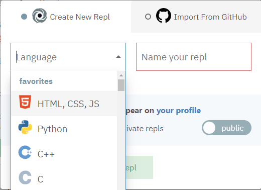 Name your repl 부분에 자신이 원하는 프로젝트 이름을 적으면 된다.