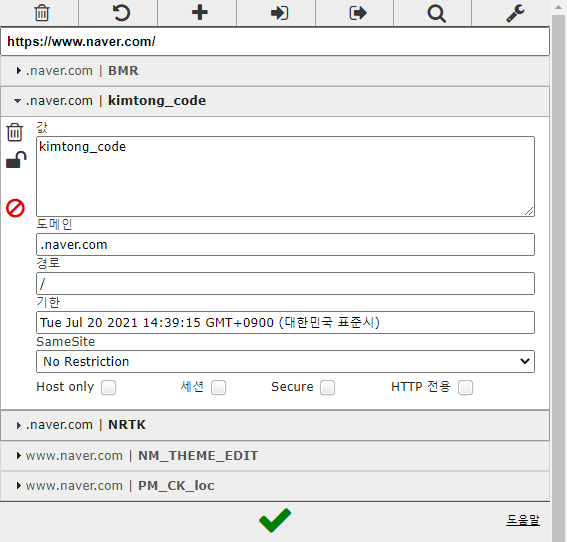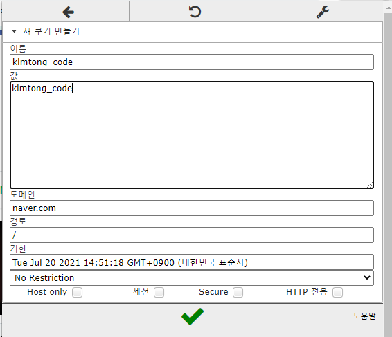 일단 쿠키를 추가하기 위해 kimtong_code 의 쿠키 이름과 kimtong_code 의 쿠키값을 넣어준 다음 맨 밑에있는 v 버튼 초록색 부이 버튼을 누르면은 자동으로 쿠키가 생성된것을 볼 수 가있다.