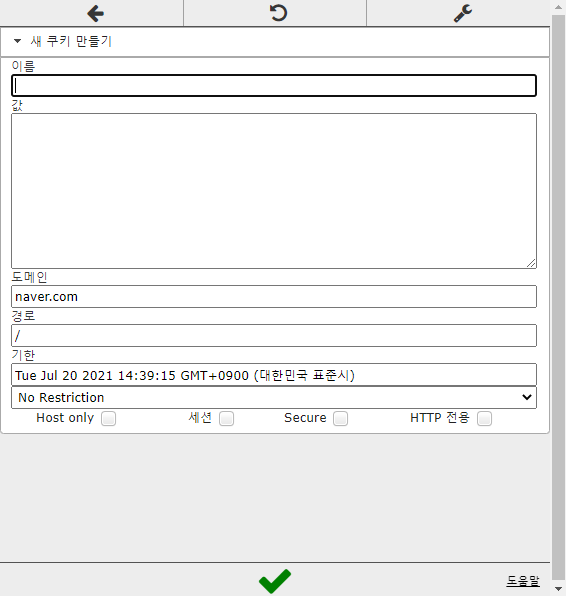 이렇게 나오는데 여기에서 이름 하고 값 부분에다가 사진이 원하는 쿠키 이름과 쿠키 값을 넣으면은 된다