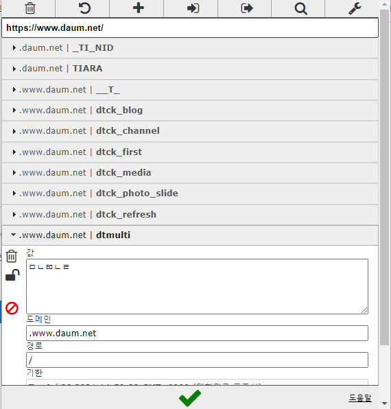 자신이 원하는 쿠키 이름의 값을 클릭해서 원하는대로 값들을 직접 수정하면은 된다.